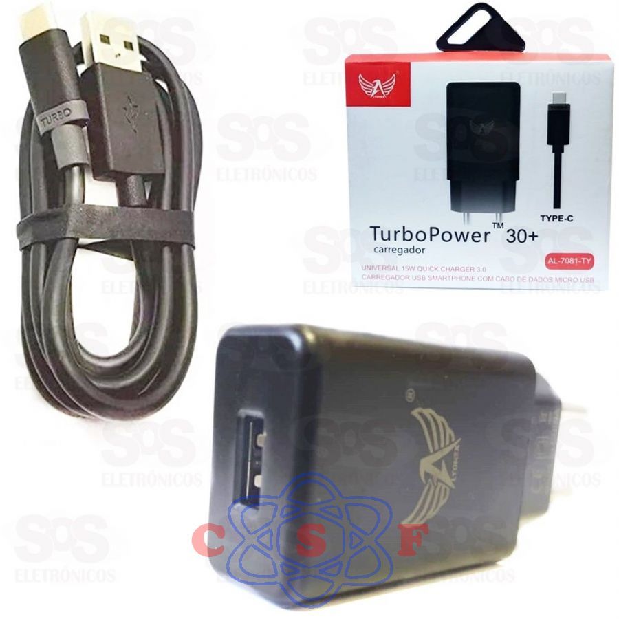 Carregador Celular Altomex Turbo Power 3,0A Bivolt Saida USB 5V=3A 9V=2A 12V 1,2A AL´7081 TY + Cabo USB + Tipo C |